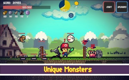 Геймплей Pixel Survival Game условно разделен на две части: в течение дня вам необходимо развивать хозяйственную часть, а ночью отбиваться от орд кровожадных монстров. Чтобы встретить их во всеоружии, подготовьте пару-тройку сюрпризов, расставив по периметру вашего нового дома ряд хитроумных ловушек и капканов.