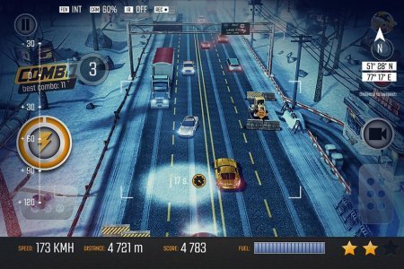На трассах не придется скучать. Собирайте во время движения бонусы: монетки, канистры с топливом, модификаторы, и т. п. Контролируйте уровень топлива, ведь если оно закончится, прохождение этапа придется начинать вновь. Приложение снабжено различными режимами, среди которых есть бесконечный режим прохождения и «Карьеры». Вас ждут не только стремительные заезды, но и сумасшедшие гонки с полицией. Постарайтесь не попасть в лапы к суровым копам, выжимая из автомобиля все его лошадки, и используя хитроумные приемы.