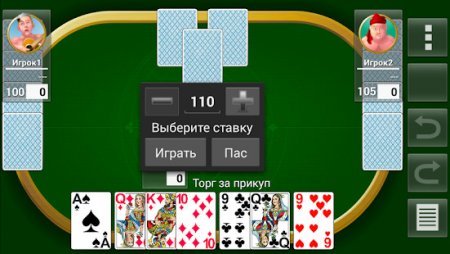 Итак, вашему вниманию представлена та же самая игра, только адаптированная под ваши устройства на базе Андроид. Естественно есть у нее и свои плюсы, по сравнению с прародительницей. Во-первых, вам доступна база данных с игроками, с помощью которой вы сможете подобрать себе теплую компанию единомышленников в любой момент. Во-вторых, игра снабжена легким интерфейсом, тренировочным режимом, позволяющим овладеть всеми нюансами до встречи с реальными противниками. Также разработчик использовал графические возможности современных устройств, и сделал великолепную анимацию, возникающую при любом перемещении карт. 1000 - увлекательная игра. Немало людей, усевшись перекинуться в картишки на часок, пропадали в ней на полдня. Она легкая и азартная и отлично скрашивает досуг. Легко открывается и занимает мало пространства на диске вашего девайса. В игре существует несколько режимов. Вы можете играть в онлайн-режиме, или связываясь с другими игроками по блютузу.