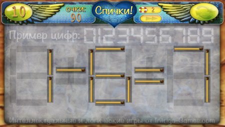 Перед вами математическое равенство. Путем перестановки спичек вы должны привести обе стороны равенства к правильному результату. Вначале у вас будет три подсказки. Правильное решение задачи также дарит игроку одну подсказку. Но даже если их нет не беда, просто перебирайте варианты, ведь попыток может быть неограниченное количество. Перетягивать спички можно не только в пределах одной фигуры, но и на другие фигуры, а также в отдельные слоты. Также возможно не менять цифры, а просто изменить знак на противоположный. Каждая задача может иметь не одно, а несколько решений. В таком случае принимается правильным любой вариант решения.