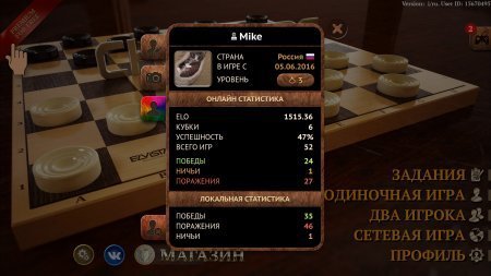 Игра шашки на двоих имеет различное оформление, под тематические праздники. Сыграйте в патриотические шашки – раскрасив доску в честь праздника Победы, или в радиоактивные в темы Чернобыля. Всего пять видов шашек, два из которых находятся в свободном доступе – Английские и Русские, а остальные три нужно покупать. Это Международные, Пул, Поддавки. Во второй версии игры Unlocked, выложенной на портале платные игры разблокированы. Мультиплеер дает возможность использовать доску для игры по сети со случайным игроком, а также в игре вдвоем на одном устройстве. Имеется четыре вида сложности игры. Начните с «Профана», после перейдите к «Любителю». А затем вас ждет «Бывалый» и «Полупрофи». Победитель попадает в ежедневный рейтинг, на основании которого рассчитывается еженедельный, а после и общий рейтинг, где самые лучшие игроки занимают верхние ступеньки. Для того чтобы играть в шашки с игроками со всего мира, вам даже не нужно учить иностранные языки, это международная игра объединяет представителей самых разных стран в одно сообщество без различения на цвет кожи, вероисповедания и минуя языковой барьер. Пусть победят самые достойные.