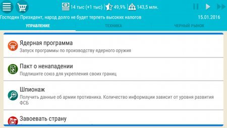 Еще вам предстоит вникнуть в работу добывающих отраслей и общей промышленности, и постараться создать для их труда благоприятные условия. Решайте множество аспектов жизни в стране: социальные, экономические и политические, и не забывайте, что каждое ваше решение будет иметь либо положительный отклик у народа либо отрицательный. Если вы хотите стать популярным президентом внимательно отслеживайте личный рейтинг, который будет колебаться каждый раз, когда вы подпишите очередной важный закон. Если ваш рейтинг вдруг достигнет нулевой отметки, значит, игра закончилась и как президент вы не состоялись.