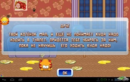 Игра разработана в оригинальной манере, но в тоже время содержит все необходимые функции виртуального питомца – тамагочи. Вам предстоит ежедневно заботиться о коте. Уход заключается в том, что вы кормите кота, укладываете его спать, садите на лоток, и играете в различные игры. Также у кота живет свой питомец – рыбка. Поэтому вам предстоит ухаживать сразу за двумя питомцами – котом и рыбкой.