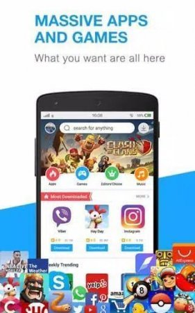 Менеджер приложения разбит на вкладки для быстрого доступа к нужным ресурсам. Путешествуя по вкладкам «Музыка», «Игры», «Библиотека» вы сможете за считанные секунды получить доступ к нужным файлам. Устанавливайте обои в один клик или скачивайте интересную книжную новинку. Также у пользователя появилась возможность настроить поиск. Нужные файлы можно отсортировать по дате добавления, популярности по скачиванию, или рейтингам отзывов пользователей. Что касается музыки, то у пользователя есть возможность перед скачиванием ее на свой телефон ,первоначально послушать, а уже после решать, начинать закачку или нет. Также интерфейс программы позволяет работать с контактами из записной книжки андроида. Вы можете скачивать рингтоны и обои и устанавливать их на определенные контакты, находясь непосредственно в интерфейсе мобильного загрузчика. Для любителей соц.сетей есть возможность интеграции с топиками и трендами Facebook и Twitter.